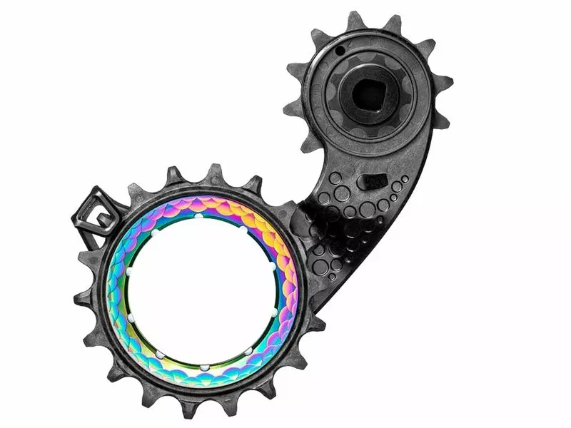 La chape AbsoluteBlack Hollowcage pour dérailleur Sram ETAP AXS Red et Force 12 vitesses est tout simplement révolutionnaire car elle repose sur un support unique de type OSPW qui offre le fonctionnement le plus silencieux, précis et aérodynamique existant actuellement. Faites entrer votre dérailleur dans une nouvelle ère ! La chape Hollowcage OSPW est donc fabriquée autour d’un support en polymer de carbone et elle intègre des roulements céramiques surdimensionnés et des galets les plus aboutis jamais créés