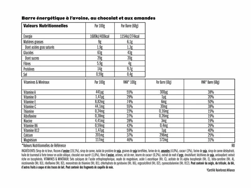 Information complémentaire sur les allergies : Contient des traces de blé, seigle, cacahuète, lait et autres fruits à coque. Peux contenir des fragments de noix