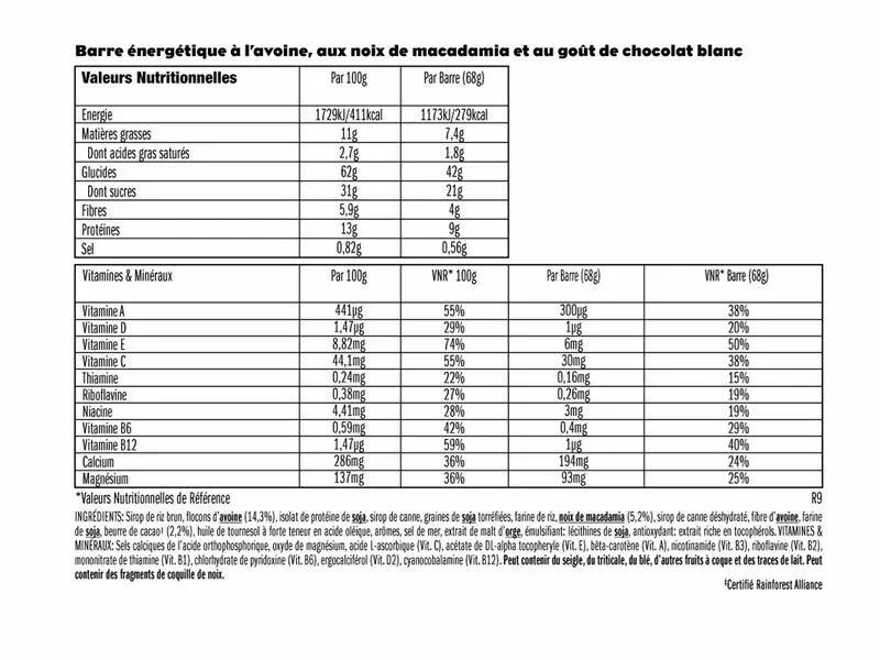 Information complémentaire sur les allergies : Contient de l’avoine, de l’orge, du soja et de la noix de macadamia et peut contenir des traces de blé , noix, lait et cacahuète