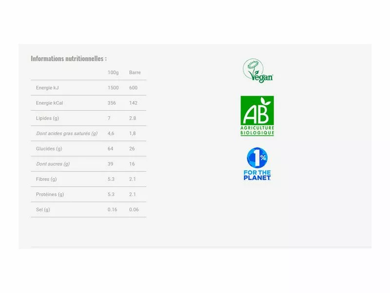 - Cette barre fabriquée à base d’ingrédients naturels peut contenir des petits morceaux de coquilles ou d’écorces.