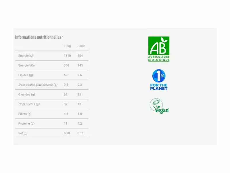 - Cette barre de 40g fabriquée à base d’ingrédients naturels peut contenir des petits morceaux de coquilles ou d’écorces.
